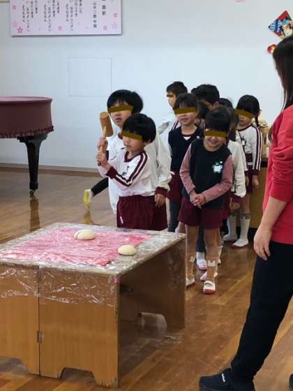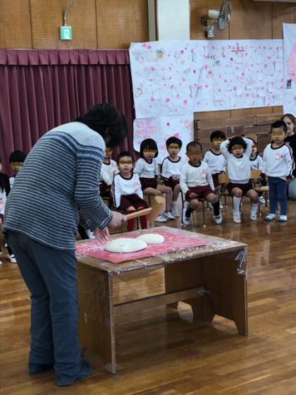 鏡開き 公開日 2024/01/12 更新日 2024/01/12 お知らせ 新しい年が明けました 今年もよろしくお願いします 幼稚園にも子どもたちの元気な姿が戻ってきました。 今日はお正月の間幼稚園に飾っていた鏡餅を鏡開きをしました。 園長先生から鏡餅のお話を聞いたあと「たくさん遊べますように」「元気に過ごせますように」とそれぞれが願いを込めて木槌で、鏡餅を開きました。 お餅は堅くてなかなかひびが入らなかったのですが、少しずつ欠けてくると大歓声が上がっていました。 いいね(0)
