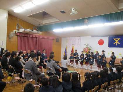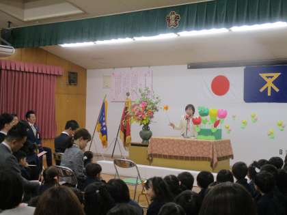 PTA会長の祝辞では、ブーメランが登場し、投げて返ってくるところを見せてくださいました。「ブーメランと同じで、やさしさや笑顔は自分に返ってくるんですよ」「いじわるしたり、お友達を傷つけてしまったりしても、叱られたり、涙になって自分に返ってきてしまいます」と、とても素敵なお話をしてくださいました。