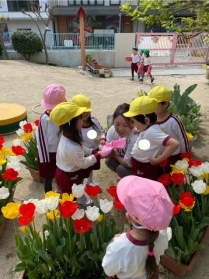昨日の入園式で登場したチョウチョが出てくると、みんなチョウチョに集まって来ました。
