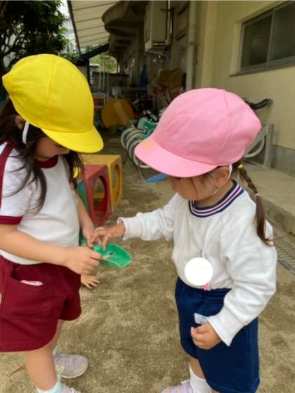 4歳児黄組さんが「先生見て!ダンゴムシ見つけたよ」とスコップにのせたダンゴムシを見せてくれました。