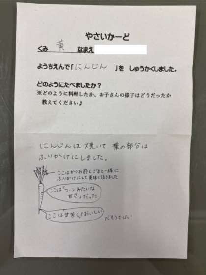 一緒に「やさいかーど」を持ち帰って、お家で食べた時の様子を書いてきてもらいました。