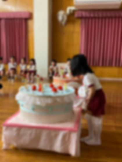 今年度初めての誕生会。大きなケーキに立てられたローソクを吹き消して、お家の人や友達、先生、に「お誕生日おめでとう!!」と言ってもらって、とっても嬉しそうな4月生まれのお友達でした。