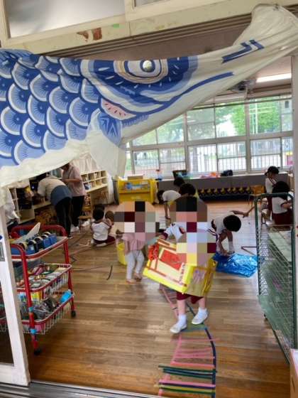 段ボールでつくった電車で、日々遊んでいる子どもたち。