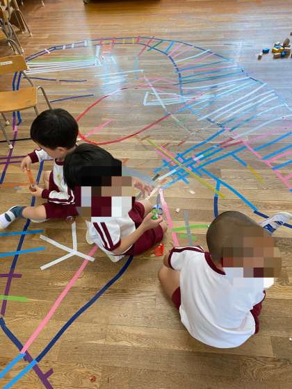 「電車が走るのに線路がいる」ということになり、毎日、色とりどりのビニールテープを床に貼って線路をつくっています。