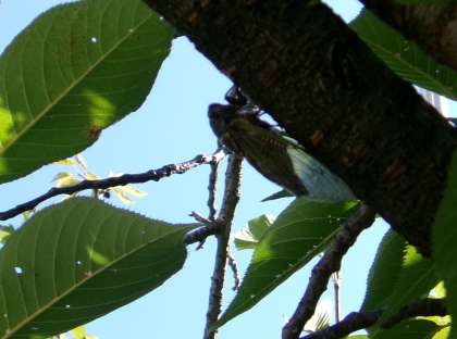 今朝、園庭で水やりをしているとセミの声がすぐ近くで聞こえました。よく見てみると、幼稚園の柿の木にセミがいました!とっても、元気な鳴き声でした♪