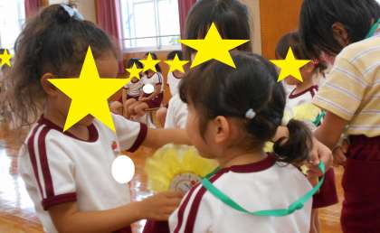 プレゼントは黄組から、ヒマワリのペンダントをもらいました。とてもやさしく首にかけてくれて、8月生まれのお友達の顔はペンダントと同じヒマワリのような笑顔でした♪