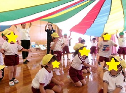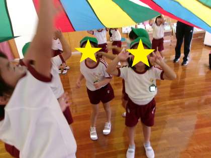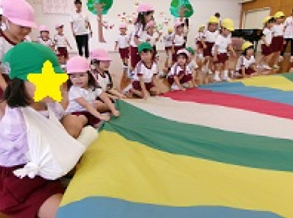 今日は、年長緑組が年中黄組と年少桃組を誘って、一緒にパラバルーンをしました。パラバルーンを見ただけで、なんだかわくわくしています。緑組が、黄組と桃組の顔を覗きながらパラバルーンの持ち方を教えてくれて、パラバルーンの中にも入れてくれました。大きなお家の中にいるみたいで、黄組と桃組は、とても楽しそうに中で飛び跳ねていました。