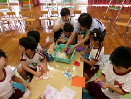 年長緑組の子どもたちは、保育室で自己紹介をして、遊戯室へ移動し、折り紙やこま、あやとりなどをして遊びました。