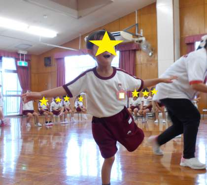 クラスの発表では、桃組みんなでトンボになって音楽が止まるとトンボさんも止まります。片足で止まっているお友達もいましたよ。