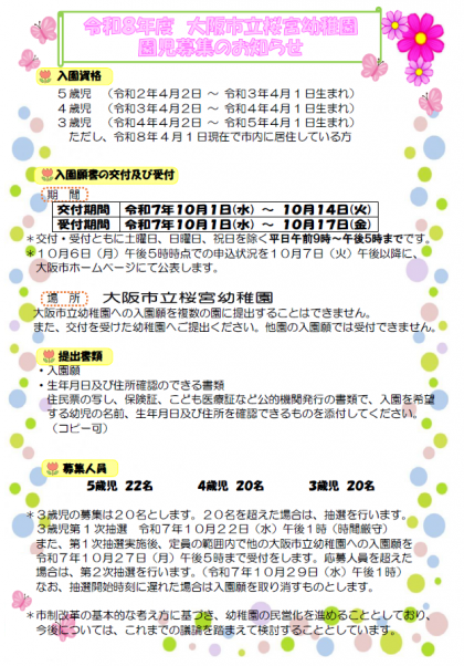 入園願書交付・受付 始まりました! 公開日 2025/10/01 更新日 2025/10/01 お知らせ 本日10月1日(水)入園願書交付・受付が始まりました。 たくさんのご応募をお待ちしております!! いいね(0)