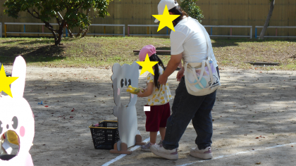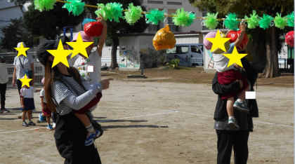 お家の人に抱っこしてもらって、子どもたちがつくったいろいろな果物の成る木から、好きな果物を収穫します。