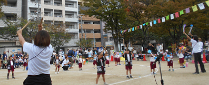 桜宮地域の方にお借りした和太鼓を、年長緑組がかっこよく打ち鳴らしてくれ、最後は、全園児がバチを持って一緒に踊りました。