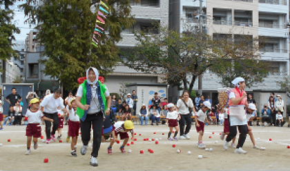 年中黄組「あつまれくだもののもり」では、追っかけ玉入れをしました。園長先生が扮するおばあさんが背負った籠に桃(白玉)を入れます。主任の先生が扮するおじいさんが背負った籠に、リンゴ(赤玉)を入れます。おじいさん、おばあさんの登場にみんな大笑い・・・今日は、おばあさんの籠の中に桃が沢山集まりました。