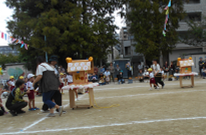 年中黄組「まつりだ わっしょい」では、お家の人と協力しながらだんじりを曳きました。