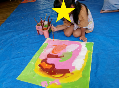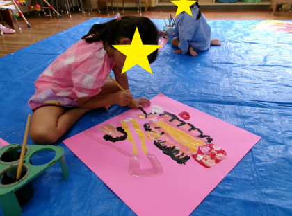 年中黄組は、一人一枚の大きな画用紙に絵をかきました。久しぶりの絵の具遊びだったからか、いろいろな色の絵の具を塗りこむことを楽しむ子どもが多かったようです。
