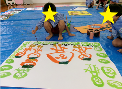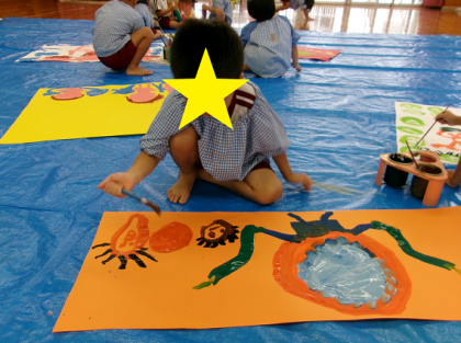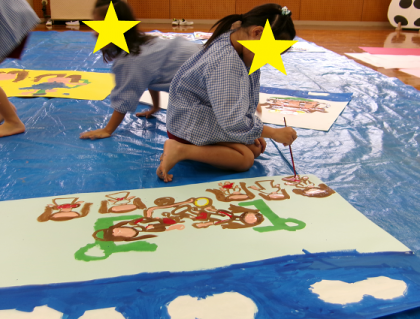 年長緑組は、大きな画用紙に運動会の絵をかきました。思い思いに表現することを楽しんでいます。運動会の最後に登場したミャクミャクの絵は、本当に動き出しそうでした。一輪車や一本歯下駄を披露しているところなど、楽しかったからこそ、伸び伸びと表現することができたのでしょう。