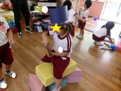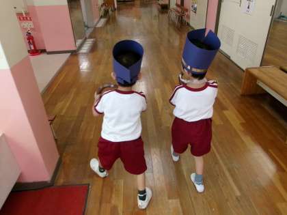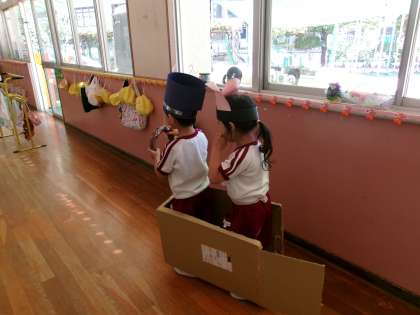 年少桃組で、「あと、4回寝たらバスに乗って行くんだよ。楽しみだね!」と話をしていると、「これ、バスやで」とダンボールをバスに見立てて乗っています。「帽子も欲しいな〜」という声が・・・そこで、手づくり帽子の登場です!