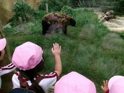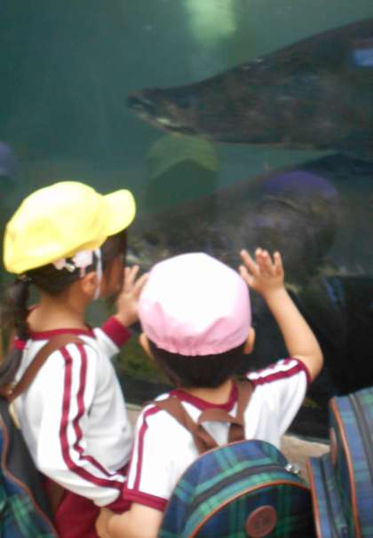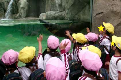 幼稚園の子どもがガラスに近付くと、動物たちも子どもたちに興味津々な様子でした。