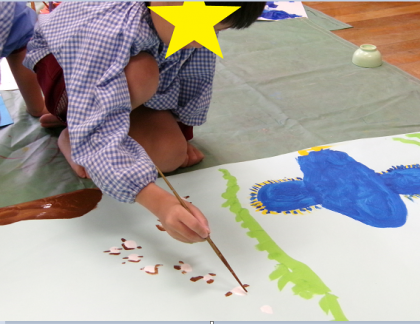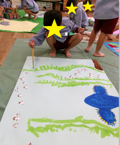 この子どもは、ハシビロコウの周りに飛んでいる小さな鳥を、細い筆で丁寧に何羽もかいていました。再び覗きに行くと、周りに生い茂っていた丈の高い草を、太い筆でかいていました。ちゃんとかくものに合わせて、筆を持ちかえているのです。
