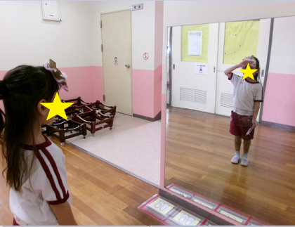 段ボールでつくったドングリ帽子に、いろいろな色の毛糸を巻きます。腕をしっかりと動かさないとうまく巻くことができません。できた帽子を自分の頭に合わせて鏡で見ている子どもがいました。かわいいですね。