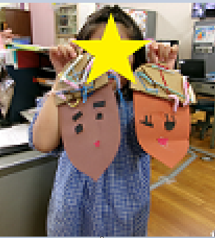 思い思いの帽子をつくった後は、ドングリのお顔を切り紙でつくります。表情豊かなドングリができあがりました。職員室に「園長先生、見て」と見せに来てくれました。男の子と女の子のドングリだそうです。女の子のドングリには、まつ毛が付いていましたよ。