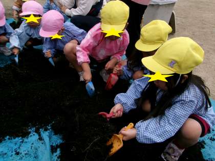 年中黄組さんは、夏の花が咲き終わったプランターの土をひっくり返して空けていました。年少桃組は「私もやってみる」とプランターを持ち上げてみるととっても重い・・・。