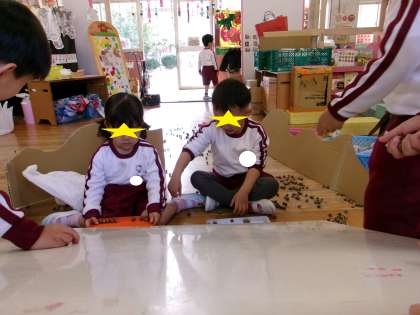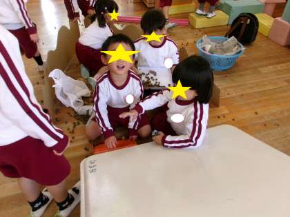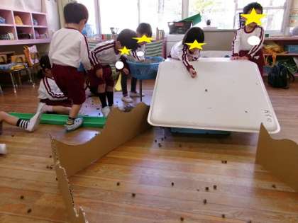 ボールを転がしたり、車を滑らせたりして遊ぶことが大好きな年少桃組の子どもたち。今日は滑り台をつくって、昨日拾って来たお土産のドングリを転がして遊びました。