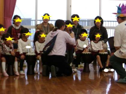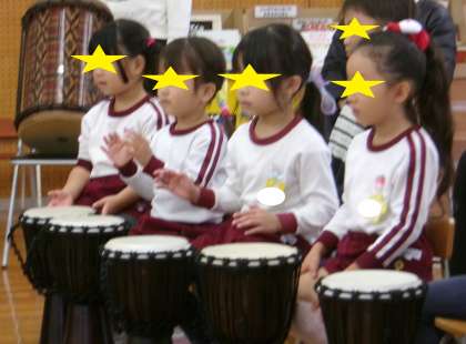 「お腹に音が響いて楽しかった」「早く叩いたとき、面白かった」などという声が聞かれました。年長緑組は「このリズムが楽しかった」と太鼓を鳴らして見せてくれました。