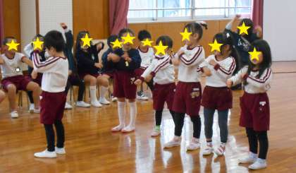 クラスの発表では、年中黄組が「どんぐり」の歌を、どんぐりのように転がって歌ってくれました。