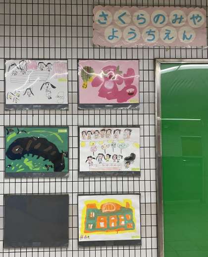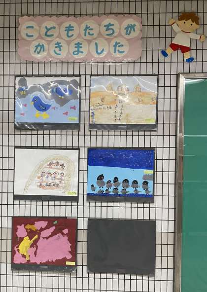 園外保育(神戸動物王国・大阪城公園・中央公会堂で「うたごえひびけなにわっこ」)や園内での芋掘りなど、楽しかったことを、ペン画や絵の具で表現しています。