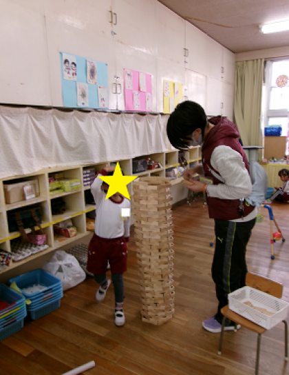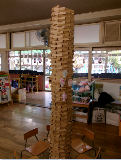 お母さん先生がいるからこそでしょうか?!「自分の背より高いんだよ」と知らせてくれました。こんなに高く積むことができて、大満足でした!!