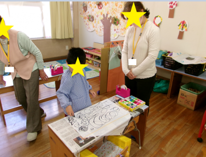 黄組では、凧あげの凧に絵をかきました。地域の方が、押さえてくれるので、マジックですいすいとかくことができました。「なんの絵かいたん?」「上手やね」と言ってもらって、嬉しそうな子どもたちでした。