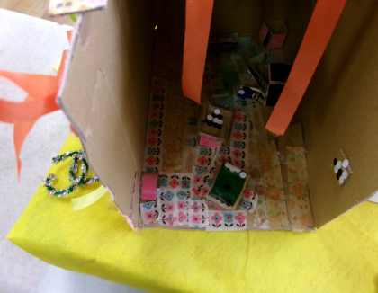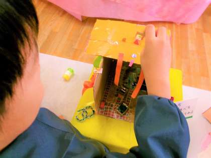 このお家の中を見せてもらってびっくり!!小さいオセロゲームがありました。小さく切った厚紙に、小さな白い〇シールと黒い●シールが並べて貼られていました。芸が細かいですね〜