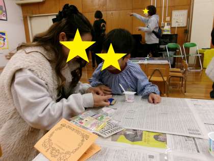 遊戯室では、親子製作で枝を三角や四角に組んだものに、毛糸やモール、ドングリなどを飾ってつくりました。お家からも付けたい飾りを持って来て、じっくりとお家の人と相談しながらつくっていましたよ。お家の人と子どものオリジナルの飾りが出来上がりました。お家に持って帰るのが楽しみですね。