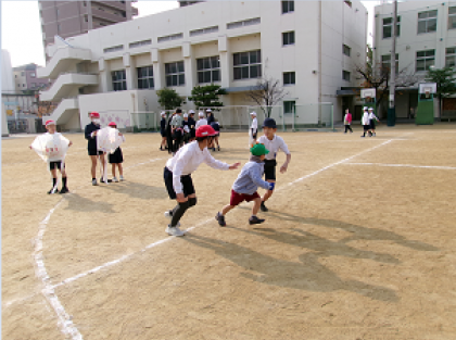 年長緑組が、桜宮小学校の校庭でたこあげをしました。