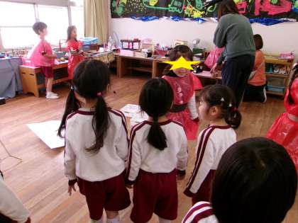 そのとき、年長緑組から大きな太鼓の音が聞こえてきました。行ってみると、サンタさんの服を着たお兄さん、お姉さんが楽器遊びをしているところでした。「運動会と同じ太鼓?」と聞くと、「違うよ。これは大太鼓だよ。」と教えてくれたり、「サンタさんの服、着る?」と聞いてくれたり・・・優しく接してくれました。緑組さん、ありがとう。
