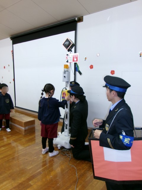 始業式の後で、JR京橋駅の方を始め5名の駅員さんが来園し、安全教室をしてくださいました。スキマモリ(着ぐるみ)もやって来て、ホームから落ちない様にすることを教えてもらいました。もし、ホームから落ちた時には緊急停車ボタンを押すことも実際にボタンを押しながら教えてもらいました。