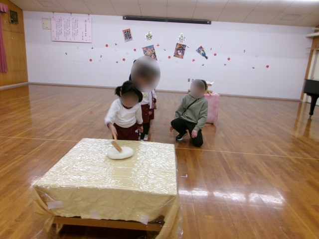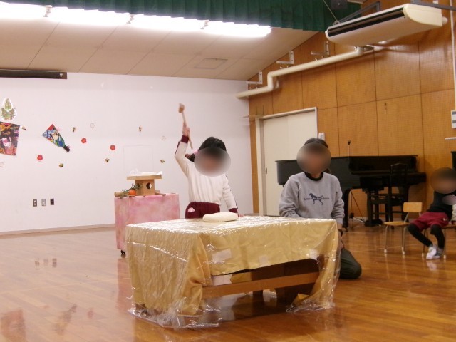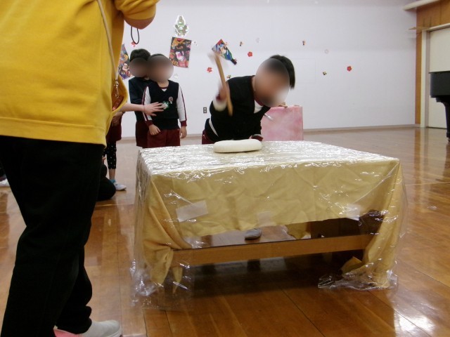 年末に『鏡餅』をつくる様子を見た子どもたち。今日は、木槌を使って鏡開きをしました。