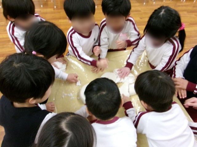 園長先生から、鏡餅の由来を聞きました。「丸い鏡餅は『円満』と言ってみんな仲良くという意味があるんだよ」「串柿は『いつもニコニコ仲睦まじく』みんなが仲良しでいられますようにと願いを込めて飾るのよ」などと、鏡餅の飾りの由来を聞きました。
