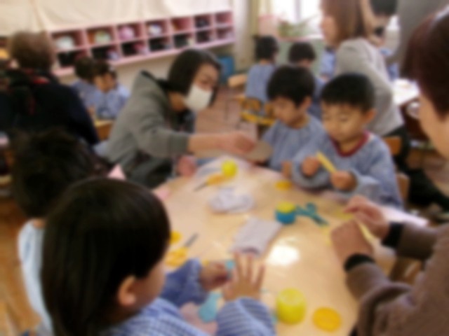 4歳児黄組は、地域の方に「さんびきのこぶた」の絵本を読んでもらった後で、一緒にこぶたをつくりました。りぼんを付けたり、にこにこわらっていたりしてかわいいおおぶた・ちゅうぶた・こぶたが出来上がりました。