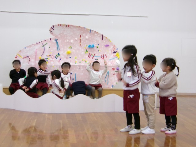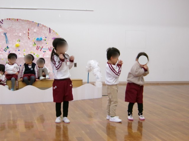 年少桃組の劇遊び『てぶくろ』で、クマになって登場する子どもたち。足を高く上げては、ドシン、ドシンと張り切って登場します。雪の中を歩いて寒いクマさんたちは、マラソンの後でしている『こすれ、こすれ』の音楽に合わせて、背中をこすり合いっこします。もう、かわいくて仕方がありません。早く生活発表会で、お家の皆さんに見ていただきたいです・・・