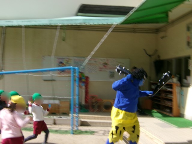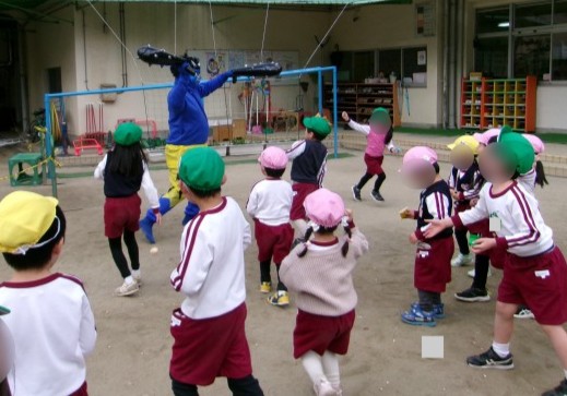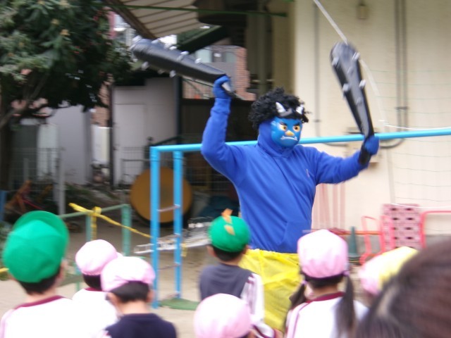 園庭に集まって、「みんなの心の中にいる泣き虫鬼や弱虫鬼、目に見えないところにいる風邪ひき鬼やお腹痛鬼を、豆まきをして追い払うのよ・・・」と、お話していたときのことでした・・・