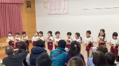歌と楽器遊びも楽しみました。この写真から、どれだけお家の人が真近かにいるか伝わるでしょう・・・子どもたちは、前に立つだけでもドキドキの瞬間でしたが、子どもたちのかわいい姿に、会場全体が笑顔で包まれていました。