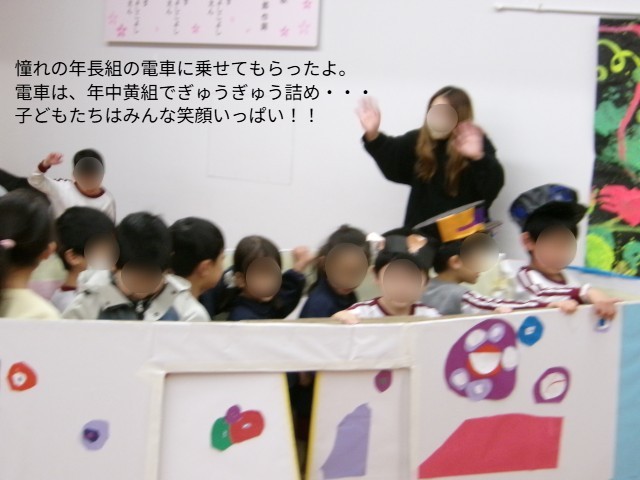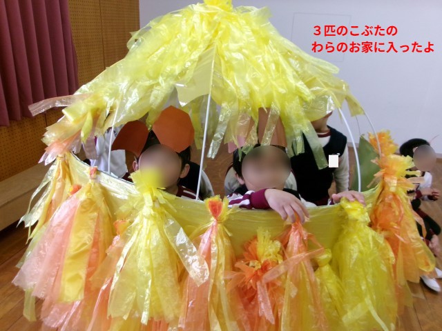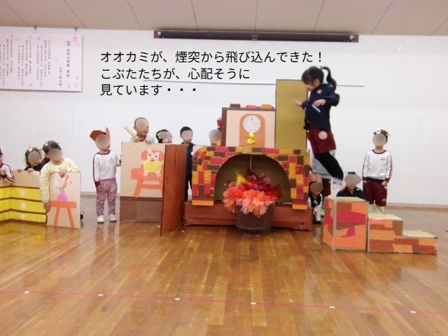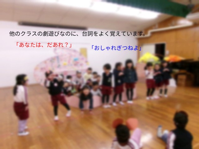 全学年遊戯室に集まって、年齢に関係なくみんなで各々のクラスの劇遊びに参加しました。これまでの活動の中で、劇遊びを見合いっこしてきたので、他のクラスの劇遊びを覚えていて、どのクラスの遊びにも楽しく参加することができました。