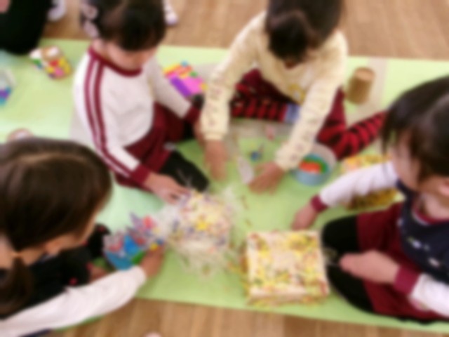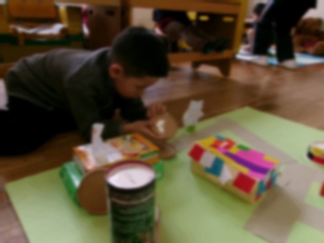 生活発表会後、3びきのこぶたのわらのお家・木のお家・レンガのお家をつくりました。お家が出来上がると「ここにわらのお家おく」「狼が来たよ!ふーふーふー」と、つくったお家で遊んでいました。とても大好きなお話なので、子ども同士で大盛り上がりでした!!