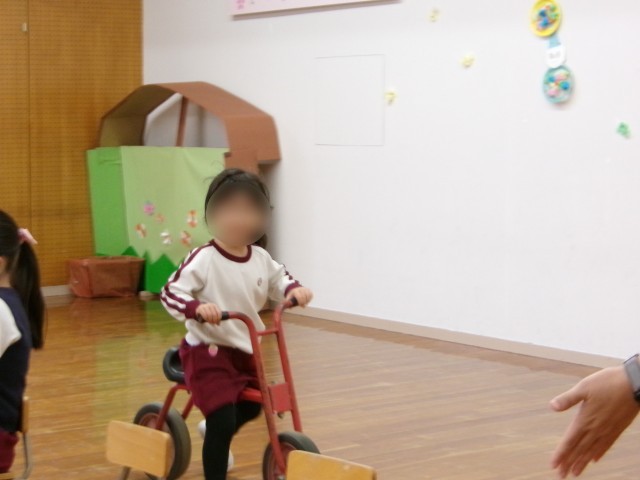 2月生まれの誕生会で、3人のお友達のお祝いをしました。長縄を跳んだり、三輪車に乗ったり、ポンポンを振りながら走ったりして入場。
