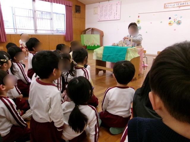 園長先生が、『3匹のこぶた』のお話を組み木を使ってしてくれました。子どもたちは食い入るように見て楽しんでいました。親子で『三匹のこぶた』の藁のお家と木のお家をつくる競争をして遊び、大盛り上がりでした。