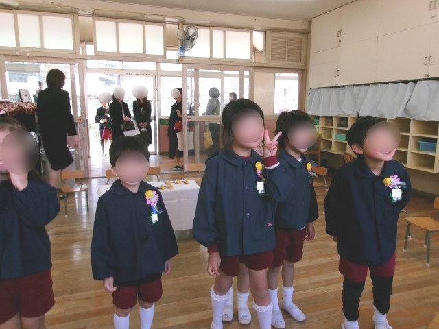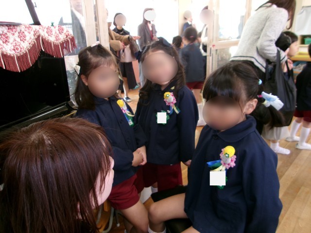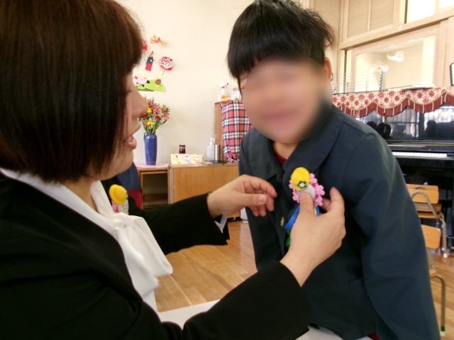 保護者有志がつくってくださった愛情いっぱいのコサージュを、胸に付けてもらい、とっても嬉しそうな子どもたちでした。