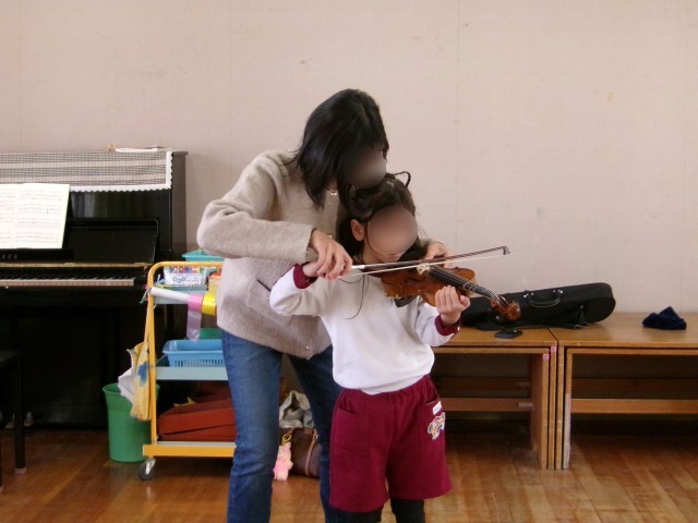 卒園したお友達とお家の方が、バイオリンを持って幼稚園に来てくれて、さくらっこ(預かり保育)で『メヌエット』を演奏してくれました。その後、一人ずつバイオリンを弾かせてもらったり、触れさせてもらったりしました。