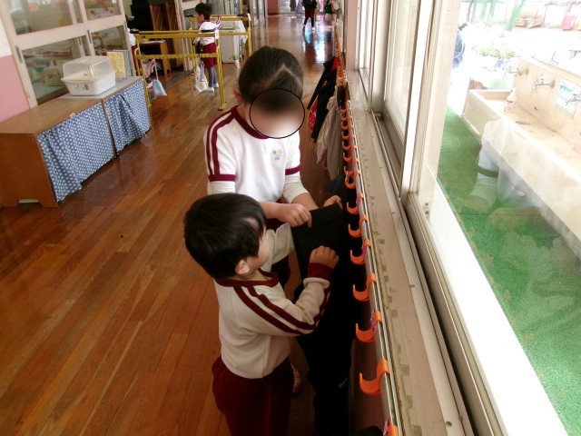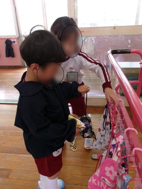5歳児緑組のお兄さんやお姉さんにお手伝いしてもらいながら、朝の用意をしました。